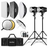 (47). Godox Studio Flash Light Kit for Photography, Strobe Softbox Lighting Kit, 2x180W Daylight Compact Monolight with Flash Trigger, Softbox, Light Stands, Reflector Storage Bag, Umbrella, AC 110V Powered