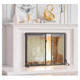 (22). Kingson 37.8x30.7 in Flat Fireplace Screen with Doors, 2-Pannel Handcrafted Solid Wrought Iron Decorative Mesh Classic Fireplace Spark Guard-Black