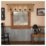 VHC BRANDS Burlap Natural Stars 72in. W x 16in. L Cotton Straight Edge Rod Pocket Farmhouse Kitchen Curtain Valance in Burgundy Tan