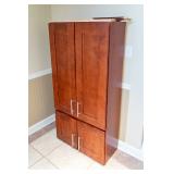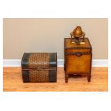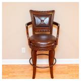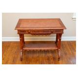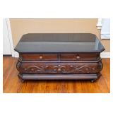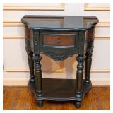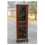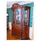 FURNITURE Black Stenciled Drop Leaf End Table, Demilune Decorated Console Table, American Signature Rolling Coffee Table, Ornate Single Drawer End Table, Large Bow-Front China Cabinet, Bassett Furniture Wardrobe, Faux Rattan Style Bar Stools, Oak Pressed and Spindle Back Bar Stools, Cherry 8' Long Coffee Table, Unassembled Fireplace Cherry Media Center, Brown Leather Reclining Chair, Button Tufted Upholstered Storage Bench, Pedestal Lamp Stenciled Decorated Table and Small Area Rug, Permacraft Three Drawer Nightstand, Four Poster Full/Double Wooden Bed Frame, Antoinette Swivel Bar Chair, Ethan Allen Solid Cherry Mirror, Small Black Vanity Cabinet, Tall Decorated Two Door Cabinet, Decorated Vanity Cabinet, Two Unopened Boxes of Furniture & more.