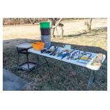 TOOLS & HARDWARE Lawn and Garden Hand Tools, Storage Rack and More, Two Metal Adjustable Shelves, Outdoor Wood Burning Fireplace In Box, Black Small Kitchen Cart in Box, Portland Electric Chain Saw With Box, Assorted Hand Tools, Three Bin Organizer in Box, Three Plastic Gas Cans, Plastic Heavy Duty Tilt Yard Cart, Two Scotts Turf Builder Classic Drop Spreaders, Small Handled Entrenching Shovel, Sixteen Foot Aluminum Extension Ladder, Troy-Bilt Gas Trimmer With Attachments, Portland 3-in 1 Electric Blower, Weed Eater Gas Leaf Blower & more.