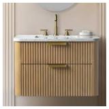 This wall-mounted vanity combines a streamlined silhouette with elevated detailing to bring modern function to your bathroom. The engineered stone countertop in Arabescato offers a clean, high-contrast surface, while the slatted base adds texture and warmth. A center-set undermount ceramic sink pairs with a soft-close, full-extension drawer to keep daily essentials neatly stored. The U-shaped interior accommodates plumbing without sacrificing space, and a flip-down tray adds extra convenience. Plus, with brushed hardware and curved edges, it delivers a sleek, finished look that fits effortlessly in contemporary or transitional spaces.