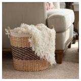This stunning, organically woven storage basket will transform any bedroom or living space by stylishly stowing away sweaters, textiles, or bits and baubles. Neatly corral any bulky, rarely used, or unsightly household items in the ample storage space, and utilize the sleek, integrated handles for easy mobility. Timeless detailing and natural appeal will carry this sophisticated storage piece through every home refresh. The storage basket is made from natural cattail, paper rope, and metal. A structured metal frame ensures the strength and longevity of the piece.