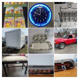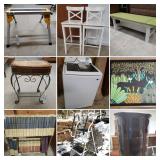 Oak China Hutch with Glass Panel Doors and Storage | 4 Sprague & Carleton Maple Dining Chairs | Round Marble Top Pedestal Table | Rectangular Brown Table with Hinged Top 36x20x31" | Adirondack Bent Hickory/Oak Rocking Chair | Southwestern Motif 4-Shelf Bookcase with Cut-Out Designs | Blue Painted Cabinet with Open Shelf and Double Doors | Five-Drawer Chest with Brass Hardware | Desk with Side Shelves and Single Drawer 40x16x29" | Laminate Desk with Hutch, Cabinet and Keyboard Tray | Desk with Curved Center Drawer and Brass Handles | Pemco Porcelain Enamel Metal Table with Shelf 30x16x32" | Hexagonal Laminate Side Table with Double Doors and Brass Pulls | Square Side Table with Open Shelf on Casters | Two-Tier Rectangular End Table with Tapered Legs | Black Two-Drawer Side Table with Brass Knobs | Spindle-Back Chair with Contoured Seat | Rectangular Bench with Floral Upholstered Seat and Turned Legs | Upholstered Stool with Decorative Fabric and Carved Legs | Child's Small School Desk with Metal Frame | School Desk Chair with Attached Writing Surface | Porch Swing with Slatted Back and Seat | 3-Piece Wicker Patio Set with Glass Top Table and Cushioned Chairs | Metal Patio Table Set with Four Chairs | White Plastic Oval Outdoor Table approx. 80" long | Traffic Signal Light with Three Colored Lenses | Female Mannequin with Floral Dress, Feather Boa, and Straw Hat | Antique Beveled Mirror 21x15" | Framed Mirror with Decorative Top approx. 48x46" | Unique Wall Mirror with Wavy Edge Design | Metal Retail Clothing Rack with Adjustable Arms | Commercial Chrome Rolling Garment Rack | Black Metal and Vinyl Folding Bar Stools | Clarin Mfg. Co. 3-Piece Folding Chair Set | Washington Redskins NFL Folding Camp Chair | Locking Aluminum Display Case 24x36" with Key | Framed Artworks (multiple lots): Landscapes, Nautical, Hunting Prints, Wildlife