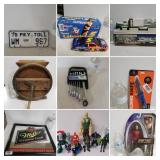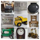 Hess Trucks (all with original boxes): 1989 Fire Truck | 1991 Gasoline Truck and Race Car | 1994 Fire Truck (2 lots) | 1994 Gasoline Fire Truck | 1995 Gasoline Truck and Helicopter | 1996 Fire Truck (2 lots) | 1996 Emergency Truck | 1998 Gasoline Toy RV with Dune Buggy and Motorcycle | 1998 Gasoline Recreation Van | 2002 Toy Truck and Airplane | Radio Flyer Scooter | Tonka Mighty Dump Truck Pressed Steel | Tonka Pressed Steel Forklift | Buddy L Japan Diecast Metal Truck and Horse Trailer | Buddy L Black and Red Toy Truck | 4 USPS Die-Cast Trucks/Banks including ERTL 1937 Ford, 1948 Diamond T, Johnny Lightning 1929 Ford Model A, Ford 1950 F-1 | ERTL 1918 Postal Vehicle Stamp Dispenser | 4 Postal LLVs with Roll Back & Go Propulsion | Green Dinosaur Ride-On Toy | John Deere S670 Combine Ertl with Lights & Engine Sounds | Evel Knievel Spectacular Poster | Puff-Puff Loco ME 660 Battery Operated Tin Toy Locomotive with Box | Delco Pleasurizer Demonstrator 1-M5-341 with Box | 3 Electronic Handheld Games: Blip, Little Professor, Merlin | Fisher-Price Music Box Teaching Clock | Snoopy Racecar and Mixed Character Toys