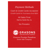For Questions Please Text 818-634-6117 Hello friends, Welcome to another Spectacular Grasons Co. Elite Estate Sale. We are honored to have been chosen to perform the sale for the wonderful family. We need to complete the cleaning and rearranging to take quality pictures. More descriptions and pictures to come so please revisit soon to get updates. Due to excessive amounts of calls, pricing will not be quoted over the phone and you must come in person for prices. Enter at your own risk, we are not responsible for injuries. We reserve the right to sell items in lots. Sign up sheet will be placed outside the home 1 hour before start time on the 1st day of the sale. (The sign in sheet is used to see who gets in first at the grand opening of the sale and anyone can still come without being on this sheet) No other list will be honored. Unattended pre-list boxes will be moved to the end of the line. You must be physically there to attend your box. If you are in your car you must make everyone know that you are still there attending your box. If you leave the premise, then your box will not be recognized for the previous spot and will be allocated to the last available spot. Bringing your own stickers to mark sold will be not be honored as reserving the item, only Grasons Staff are allowed to mark items as sold. All items that are reserved must be paid for in full. We reserve the right to allow No Bags or Boxes to be permitted in the sale. If you try and return an item that was marked sold, then you will not be allowed to make any more purchases that sale day. Grasons reserves the right sell any item to the highest bidder on high demand items. Desired items may end up in auction format at beginning of sale and any dispute on item will result in auction to the highest bidder. As always be respectful to the neighbors, home and Grasons Co. staff. We can't wait to see you! Sincerely, Grasons Co. Elite |